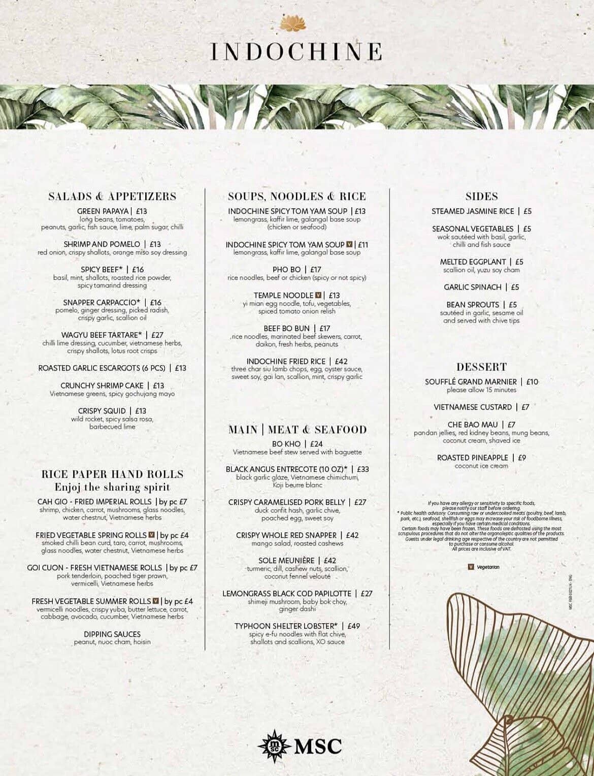 The Indochine restaurant is a very popular dinner option on MSC cruises, so advance reservations are recommended to ensure availability. Passengers can make reservations through the MSC for Me app, the ship's Customer Service area, or by contacting the restaurant staff directly.